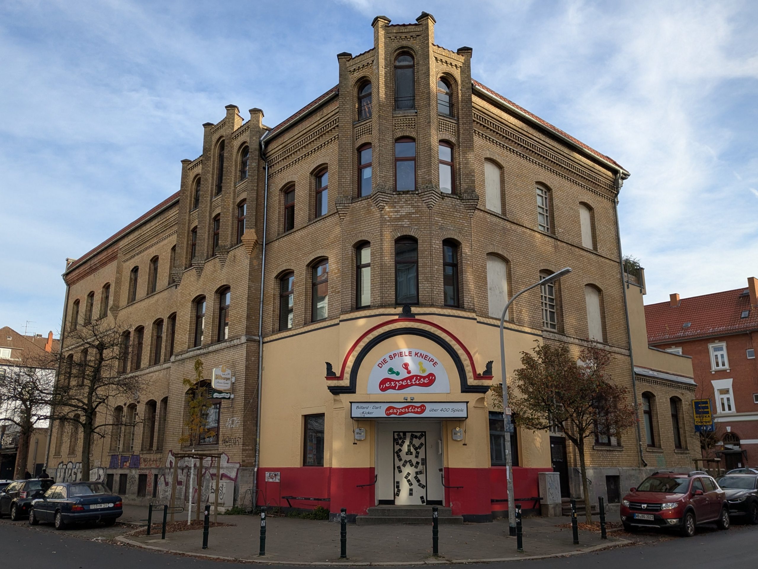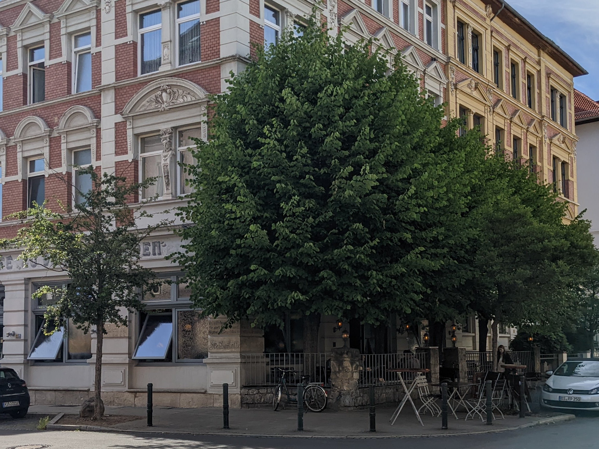 Wir beginnen in der Jasperallee in der Nähe der Okerbrücke und biegen in die Moltkestraße ein. Zunächst kommen wir an ein paar Gründerzeit-Bauten vorbei, die mit ihrem Garten an die Oker grenzen. An der nächsten Kreuzung ändert sich das Bild vorübergehend. Die Moltke- wird zur Wiesenstraße. An der Kreuzung zur Steinbrecherstraße kommen wir an der Gaststätte „Zu den Vier Linden“ vorbei. Sie ist eine der ältesten noch bestehenden und wartet mit rustikaler Küche wie Berliner Blutwurst und Hoppelpoppel auf (aber anderes fehlt nicht).