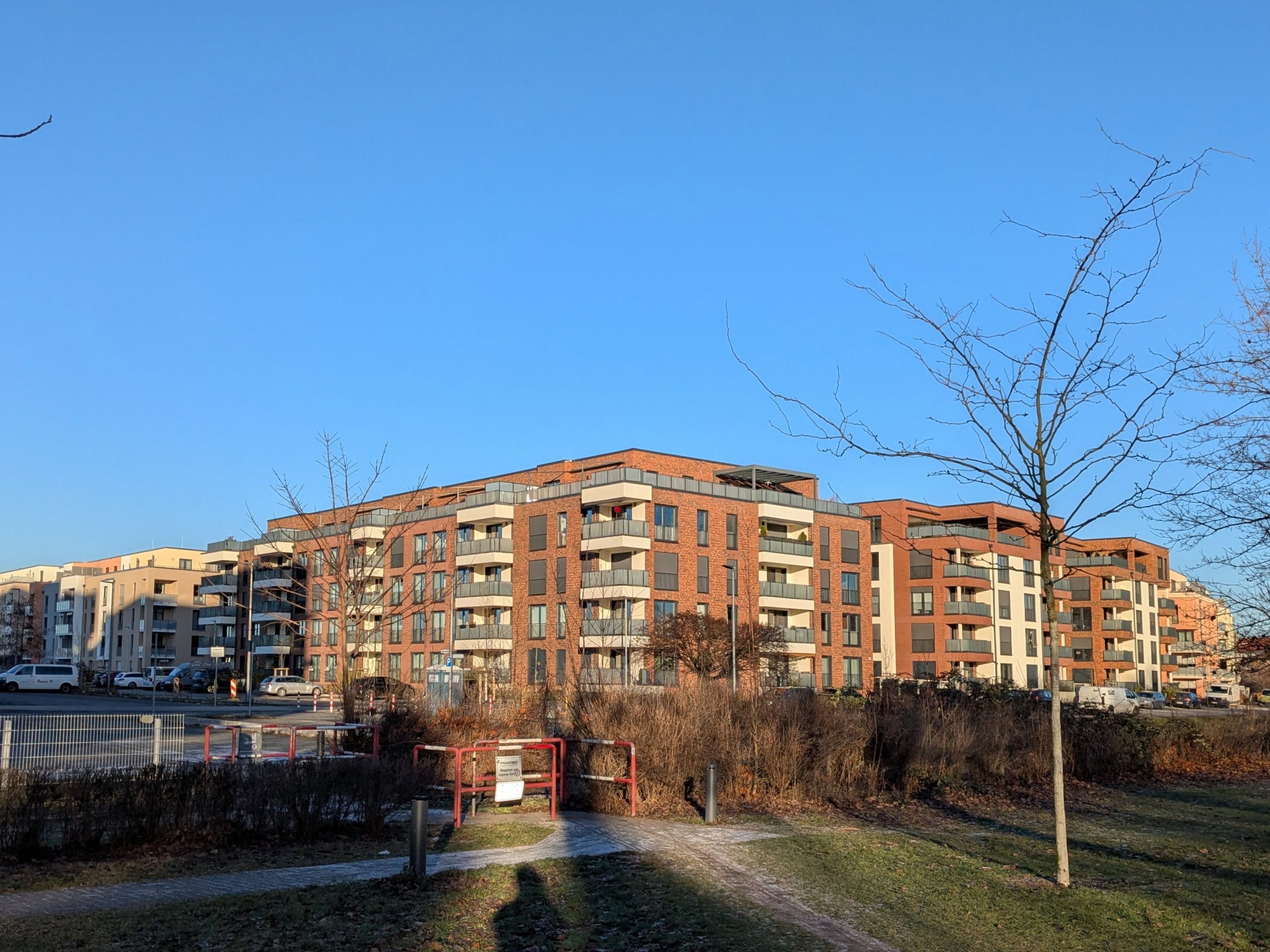 Die Wiese, an der wir später vorbeikommen, wird auch in neueren Karten noch als Ballonwiese bezeichnet, die offiziellere Bezeichnung ist Nordpark. Von hier sehen wir nach Norden ein Stadtviertel, das in den 2010er und 2020er Jahren praktisch vollkommen neu entstanden ist.