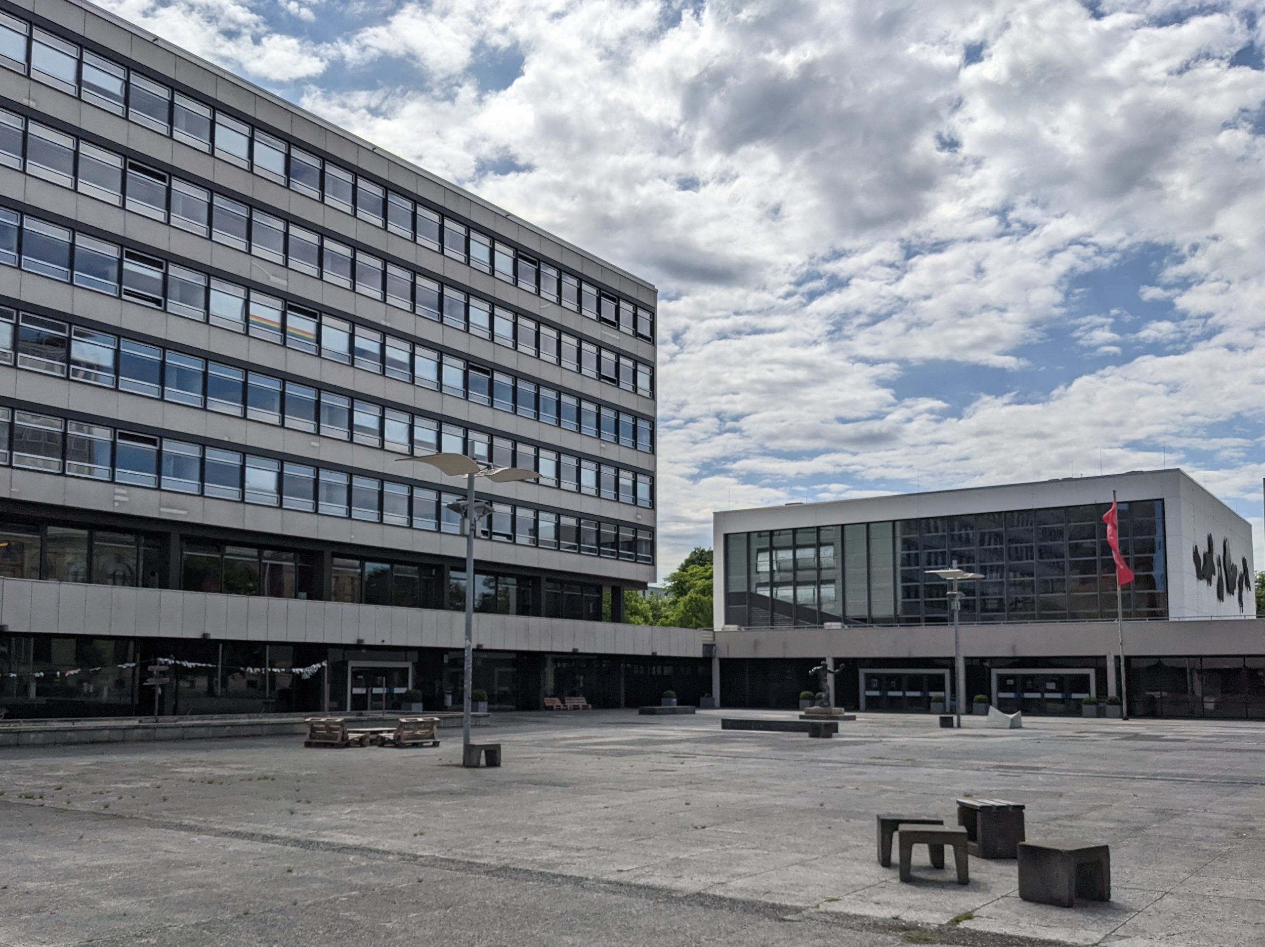 Das neueste Gebäude in diesem zentralen Bereich ist das Studierendenhaus im Vordergrund nach Plänen von Gustav Düsing und Max Hacke. Im Januar 2023 fast drei Jahre nach Baubeginn eröffnet, gefällt mir vor allem das durchlässige Erscheinungsbild, das einen schönen Kontrapunkt zum Hauptgebäude bildet.