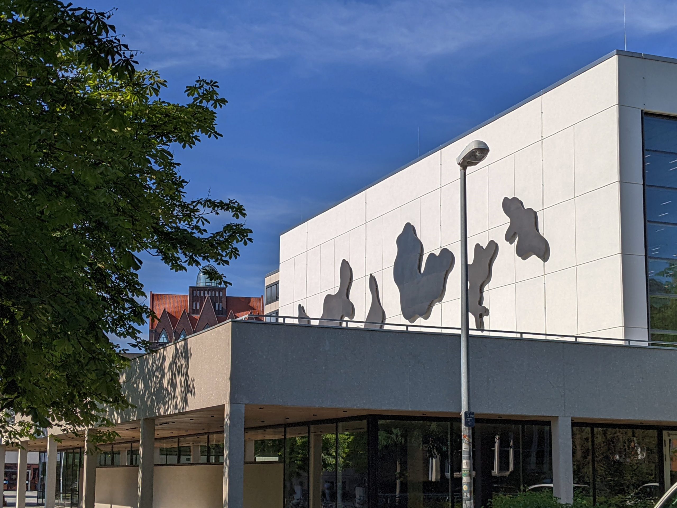 Der „Wolkenzug über nachtschwarzem Himmel“ am Audimax stammt von Hans Arp. Nanu, denkt man, wo ist hier der nachtschwarze Himmel? Tatsächlich war der kubische Hörsaal bei seiner Eröffnung dunkelanthrazit, während die Wolken aluminiumfarben waren. Beim Weiterbau des Forums wurde es notwendig, die Bibliothek (1969-71) hell zu gestalten, weswegen Kraemer der Einheitlichkeit halber auch den Kubus in heller Farbe erscheinen lassen wollte. Dies wiederum hätte die Wolkenskulptur sinnlos erscheinen lassen, wenn sie nicht dunkel gefärbt worden wären. Dafür war die Einwilligung der Witwe von Hans Arp notwendig, denn auch ein solches Kunstwerk unterliegt dem Urheberrecht.