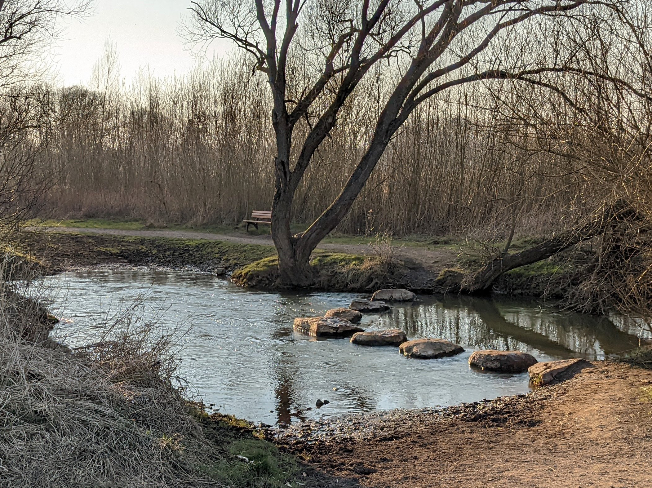 Am östlichen Punkt der Runde gibt es einige Trittsteine, die einem helfen, trockenen Fußes wieder auf die Nordseite der Schunter zu gelangen.