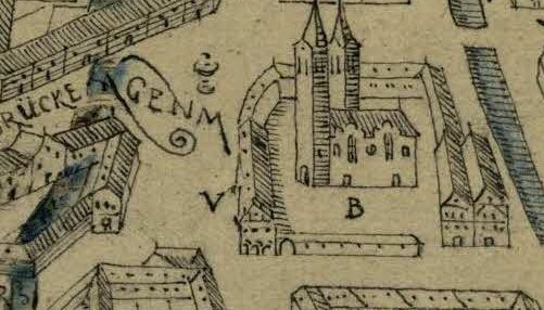 Das Opernhaus kann man sich ziemlich gut vorstellen, da Ludwig Tacke es auf einem Gemälde festgehalten hat [7]. Auf dem Bild sieht man übrigens auch den Vorläufer des Heinrichsbrunnens aus dem Jahr 1407, also kurz vor der Errichtung des Brunnens auf dem Altstadtmarkt. Der Brunnen war wohl von einem Baldachin mit einer Statue der Heiligen Katharina bekrönt. Das kann man hier aber nicht erkennen. 1814 wurde der Brunnen eingeschmolzen, um Kanonen zu bauen, die jetzt als wichtiger erachtet wurden als Heilige.