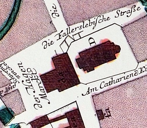 Heute geht man mit einer ziemlichen Selbstverständlichkeit davon aus, dass eine Kirche mit einer repräsentativen Fassade frei steht. Offenbar haben unsere Vorväter anders gedacht. Wie man schon auf einem Vogelschaubild von 1606 sieht, war die Katharinenkirche mal eng umbaut [5]. Vor der Westfassade standen das Rathaus des Weichbilds und ein Gewandhaus. Nachdem die Stadt 1671 von den Herzögen von Braunschweig-Wolfenbüttel unterworfen wurde, wurde das Rathaus nicht mehr benötigt. Unter anderem da bald danach in der Stadt wieder in jedem Jahr zwei Messen abgehalten wurden, die zahlreiche Besucher anzogen, wurde ein Teil der Gebäude in den Neubau einer 1690 eröffneten Oper einbezogen, die man auf einer Karte von 1755 [6] sieht.