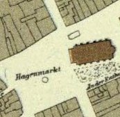 Vor den Zerstörungen des Zweiten Weltkriegs sah es hier sehr anders aus [1]. Der Hagenmarkt als Ganzes war bis auf die abgehenden Straßen ein geschlossener Platz. Die Häuser stammten aus verschiedenen Epochen.