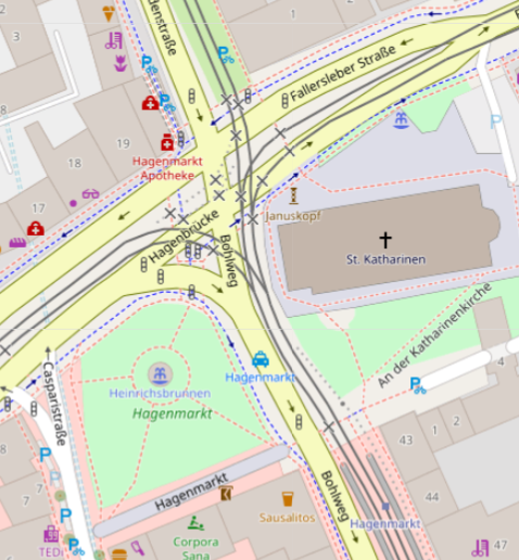 Von allen historischen Plätzen der Innenstadt ist der Hagenmarkt der, der am meisten unter der Verkehrssituation leidet. Dazu kommt noch, dass hier im weiten Umfeld fast alles im Zweiten Weltkrieg zerstört wurde – übriggeblieben ist außer der Katharinenkirche eigentlich nur der Heinrichsbrunnen. Bis hier wieder ein geschlossenes Bild des Platzes entstand, vergingen einige Jahrzehnte.