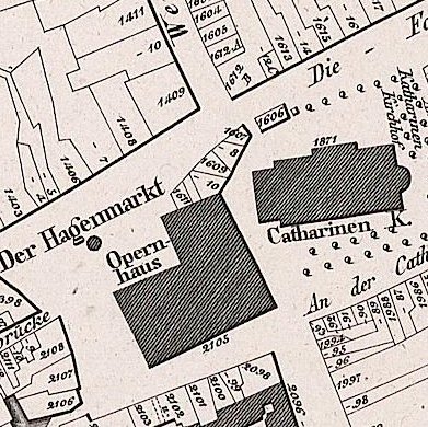 Das Opernhaus wurde im Laufe des 19. Jahrhunderts als nicht mehr repräsentativ genug empfunden. Am Ende des Steinwegs wurde 1860 der bis heute erhaltene Neubau eingeweiht. Vier Jahre später wurde im Gegenzug das Gebäude auf dem Hagenmarkt abgerissen, der nun deutlich an Größe zulegte (Kartenausschnitte von 1836 [8], 1889 [9], 2021 [10]). Die Casparistraße wurde 1884/85 angelegt und verband nun den Hagenmarkt über den Ruhfäutchenplatz mit dem Bahnhof. Möglich wurde das, weil der in diesem Bereich verlaufende Burgmühlengraben (der dem ursprünglichen Okerverlauf entspricht) verrohrt worden war.