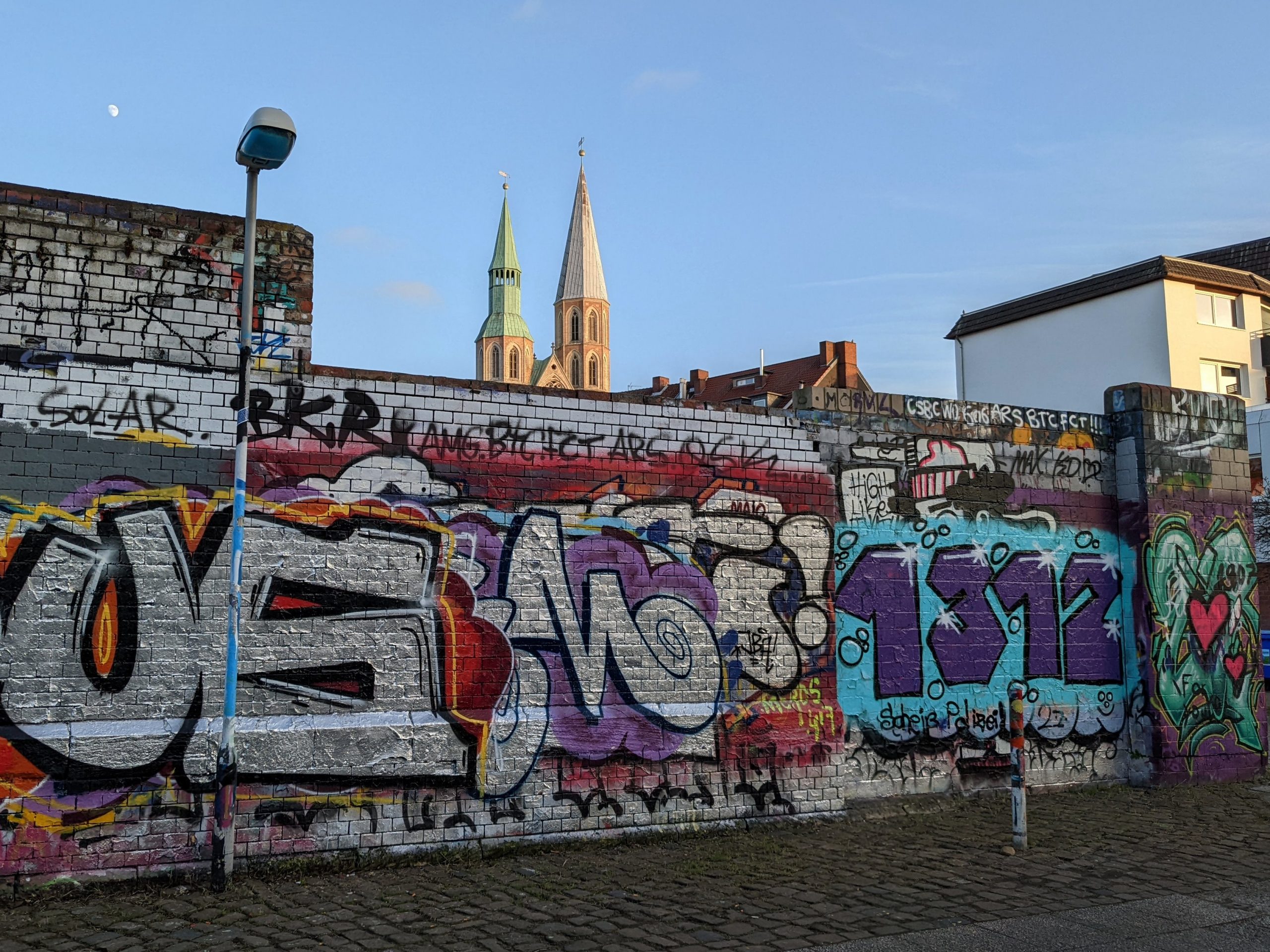 In der nordwestlichen Ecke des Hagenmarktes gibt es einen Durchgang, der uns zu einem Parkplatz führt, der mit einer weitgehend mit Graffiti besprühten Mauer umgeben ist. Hier stand einmal eine 1897 fertiggestellte Markthalle. Einige Jahre zuvor war der Burgmühlengraben verrohrt worden, so dass sich – wie auf der Strecke von Friedrich-Wilhelm-Straße bis Casparistraße neue Bauplätze ergaben. Mit der Eröffnung der Markthalle endete auch das Marktgeschehen auf dem Hagenmarkt. Nach Kriegsbeschädigungen waren von der Halle nur noch die Außenwände übrig; statt das Dach wiederherzustellen wurden einzelne überdachte Marktstände eingerichtet. Nach einem jahrzehntelangen Niedergang wurden die meisten Häuschen 1976 abgerissen; abseits von Marktzeiten wurde das Gelände Parkplatz; nach weiteren neuen Jahren war nur noch der Parkplatz übrig.