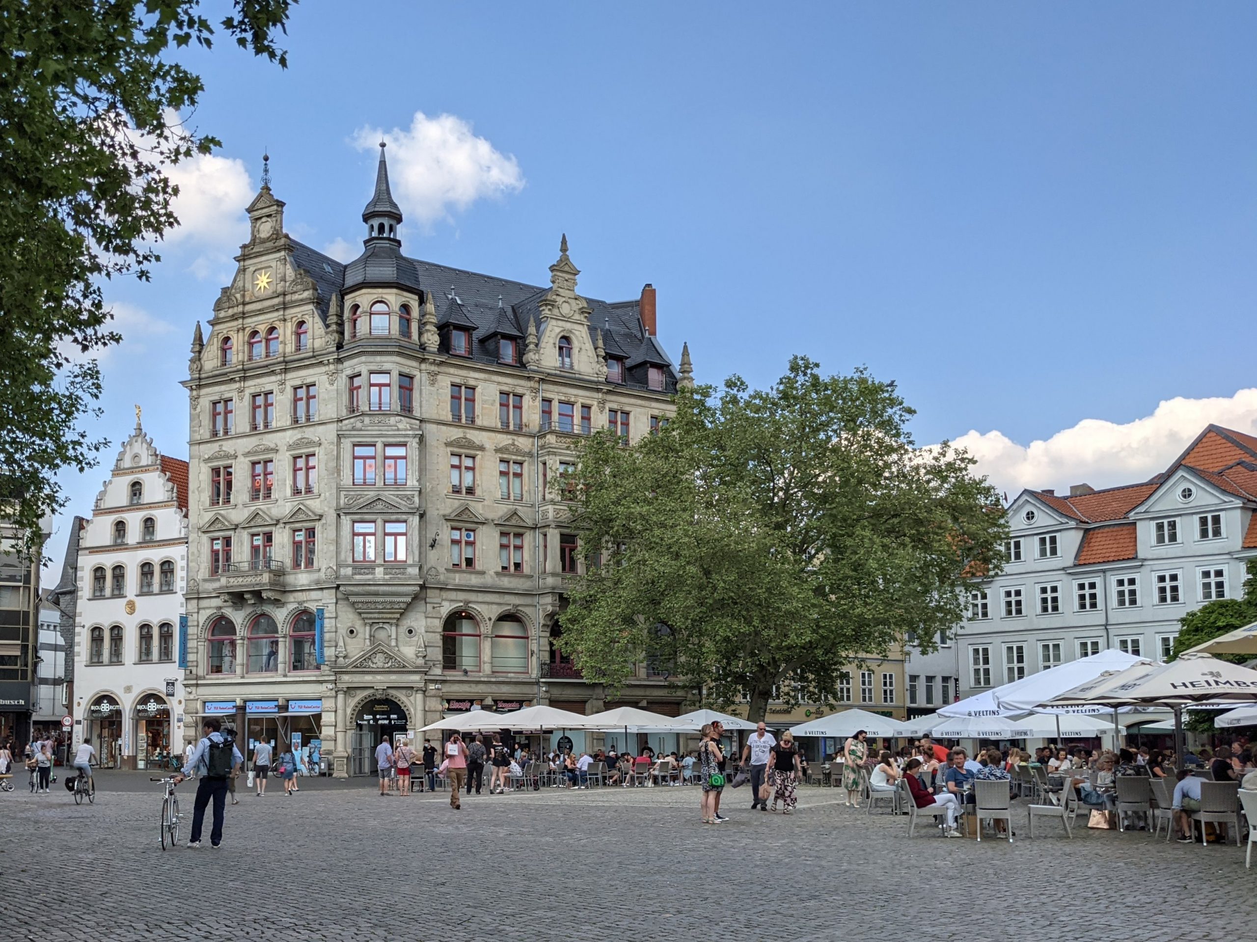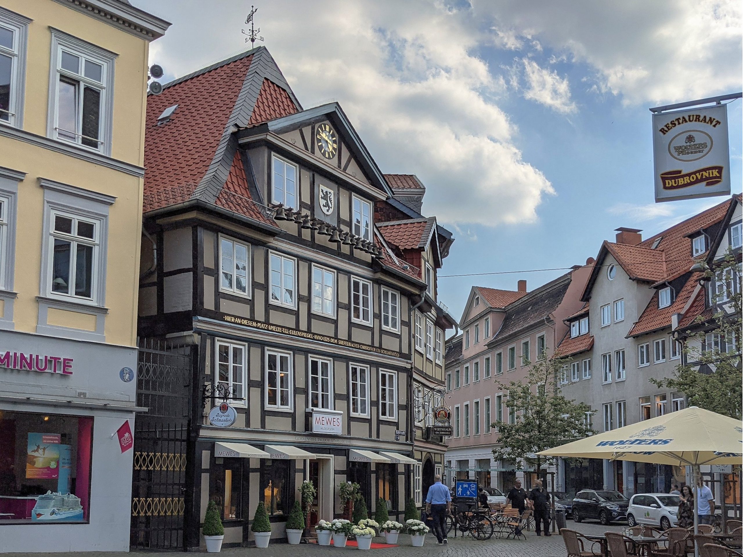 An der Südostseite des Platzes steht eine Reihe von Häusern, bei denen vor allem auffällt, wie unterschiedlich hoch sie sind. Dem städtebaulichen Puristen müsste ein Schaudern kommen, aber gerade die Buntheit der Größen und Stile macht für mich den Reiz dieser Reihe aus.