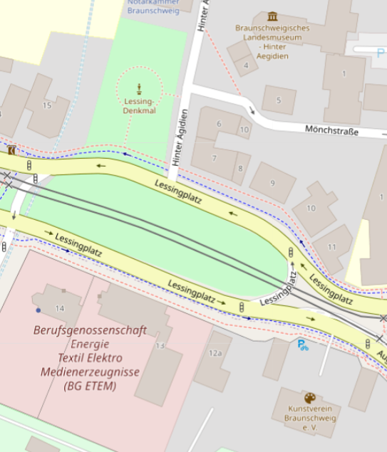 Als Besucher wird man heute als Lessingplatz den Platz um das Denkmal wahrnehmen. Dies ist aber eigentlich nur die nördliche Ausbuchtung des Platzes, dessen größerer Teil sich über die angrenzende vierspurige Straße bis zum Haus Salve Hospes (heute Kunstverein) erstreckt. Hier ein Vergleich zwischen der Situation 1836 [1], als der Platz Teil der Wallanlagen war, mit der Situation heute [2]