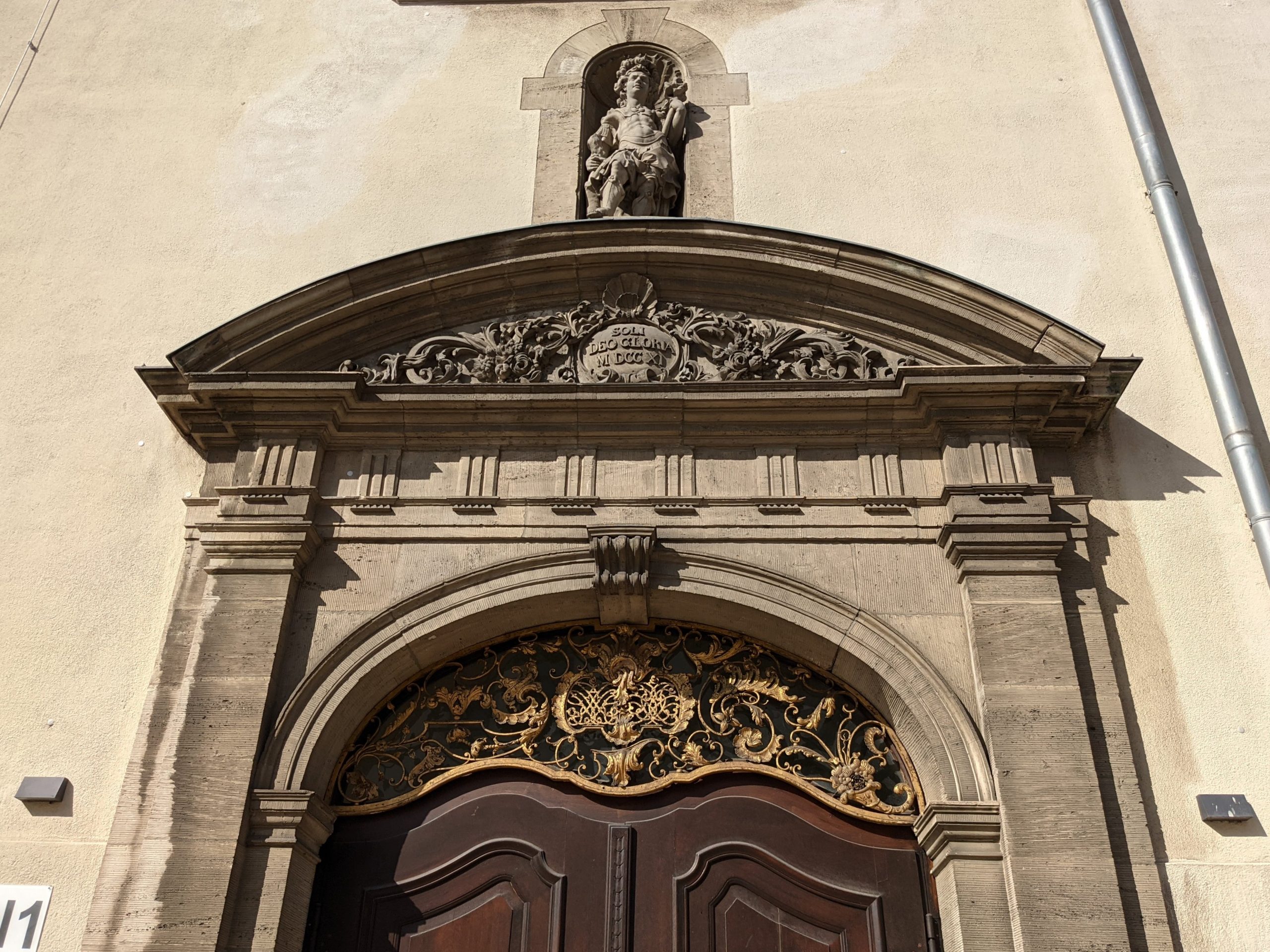 Wie in der nördlichen Altstadt treffen wir auf ein Portal, das älter als das Gebäude ist: es stammt von dem nicht mehr existierenden Eckhaus Poststraße/Schützenstraße, für das es 1711 geschaffen wurde.