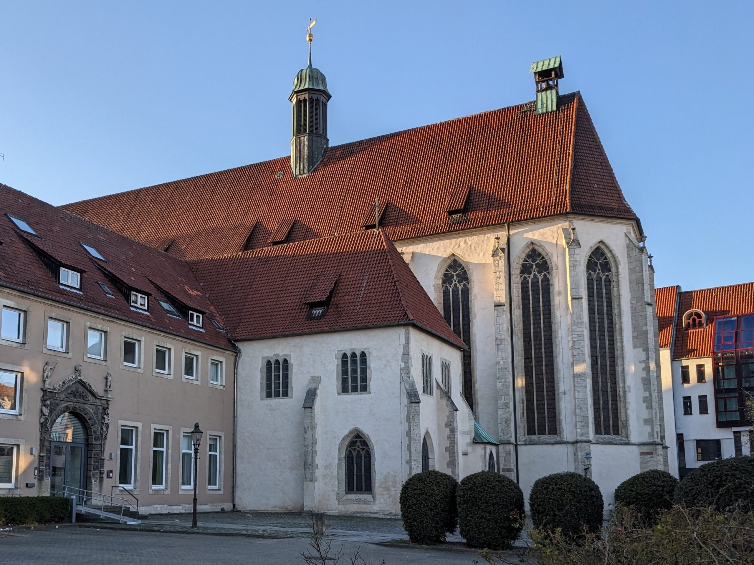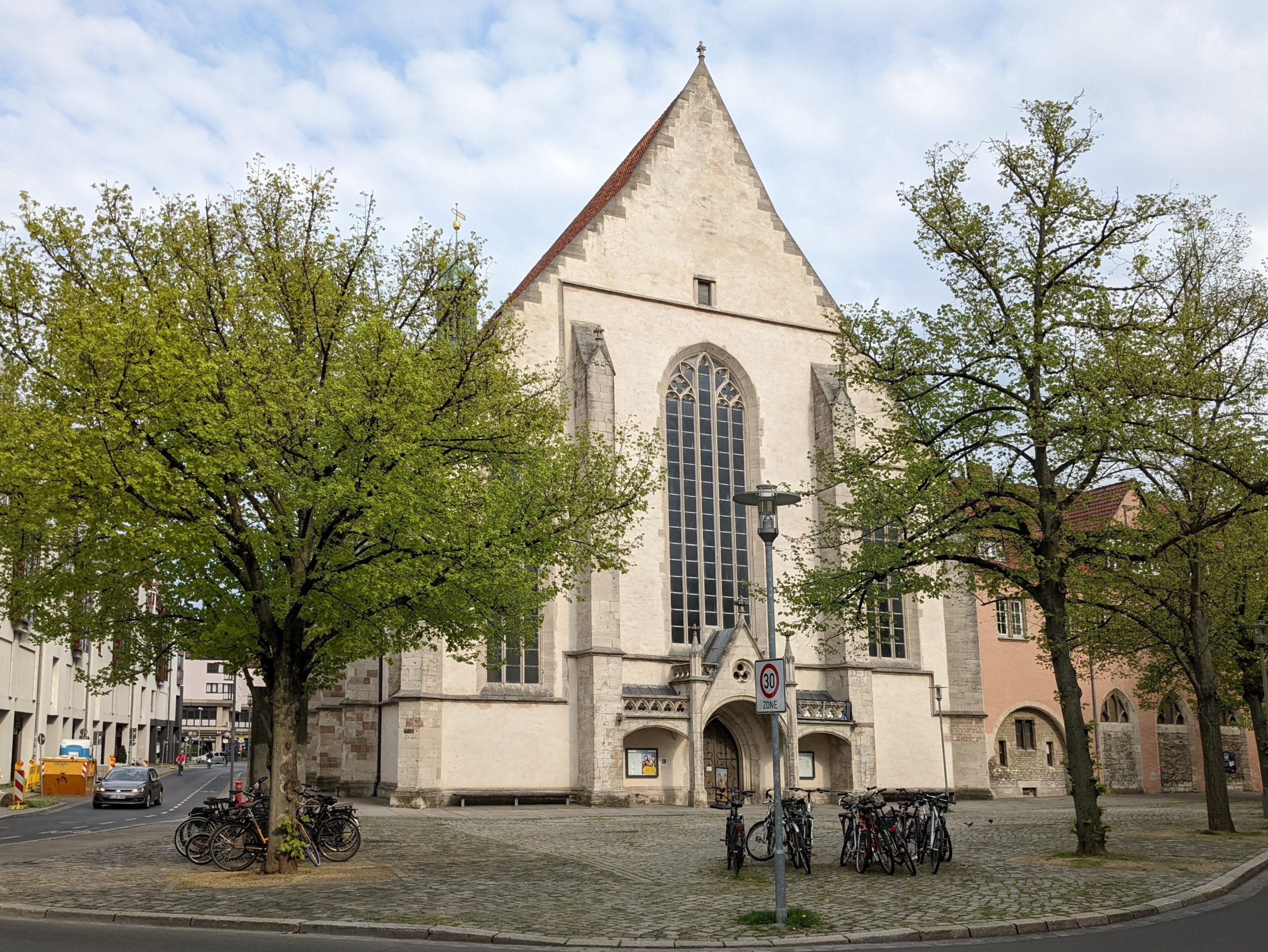 Die dritte Kirche auf unserem Weg ist die Bartholomäuskirche, zu der Kannengießer- bzw. Schützenstraße führen. Sie wird von der evangelisch-reformierten Gemeinde genutzt und ist eine der kleineren Kirchen der Innenstadt. Nach Kriegszerstörungen wurden ihre Türme nicht wieder aufgebaut.