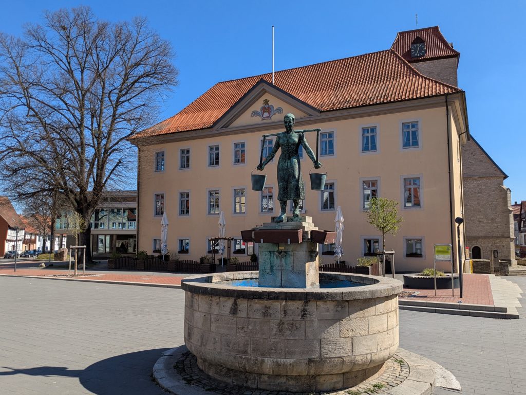 Von der Kirche geht es wieder über den Marktplatz. Auf der Nord- und Südseite des Platzes gibt es eine ganze Reihe von Fachwerkhäusern. Der Brunnen mit der „Wassermaid“ stammt aus den 1930er Jahren. Dahinter sehen wir das Rathaus. Es stammt aus der ersten Hälfte des 19. Jahrhunderts.