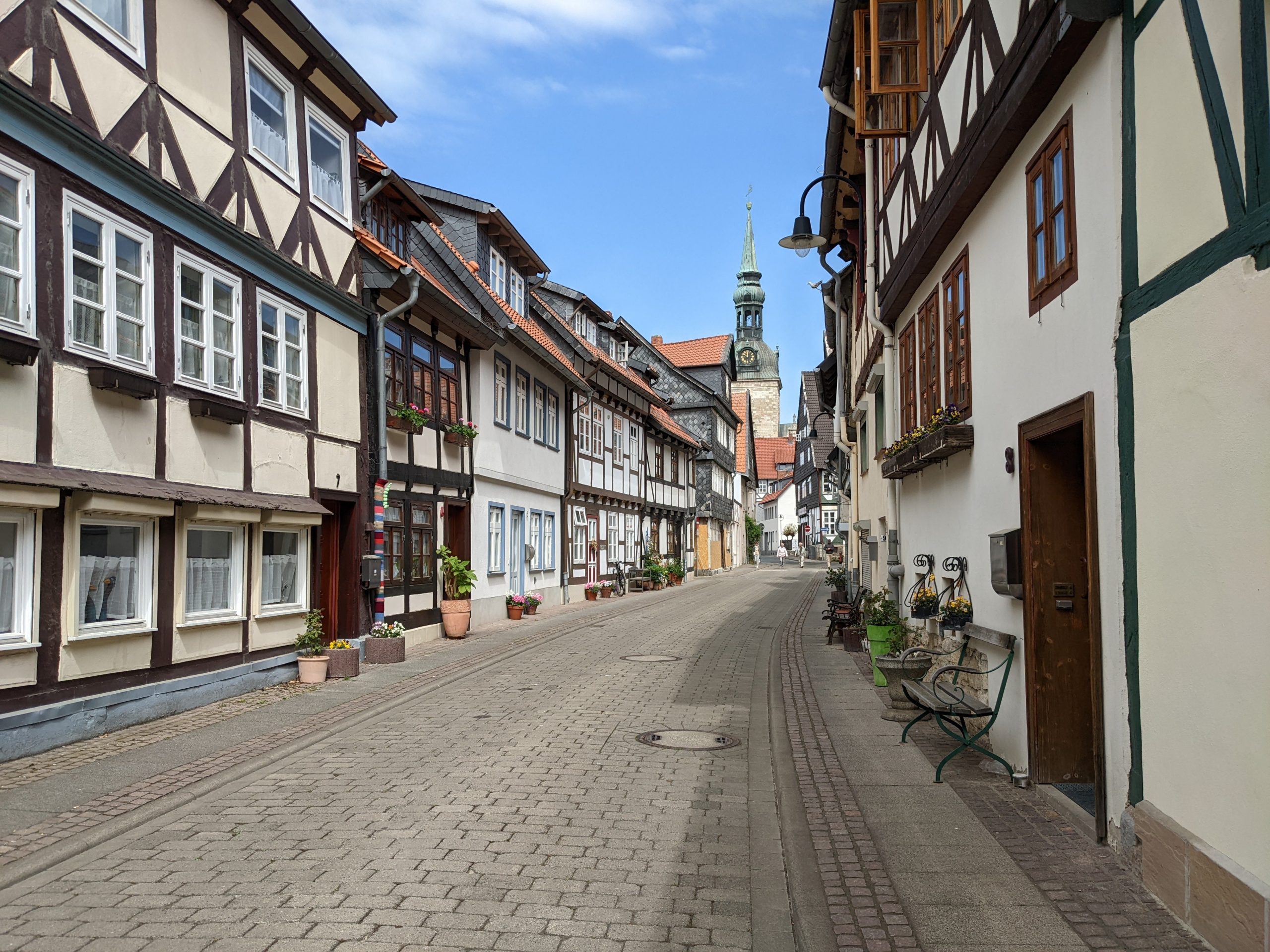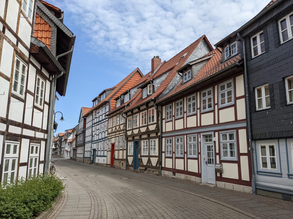 Von der Marienkirche geht es über die Kleine Kirchstraße auf die Harzstraße. Die Bebauung steigert sich nach Westen: von kleinen einfachen Häusern geht es zu stattlicheren kurz vor dem Harztorplatz, z. B. hier ein Hofbeamtenhaus mit prächtigem Wappen.