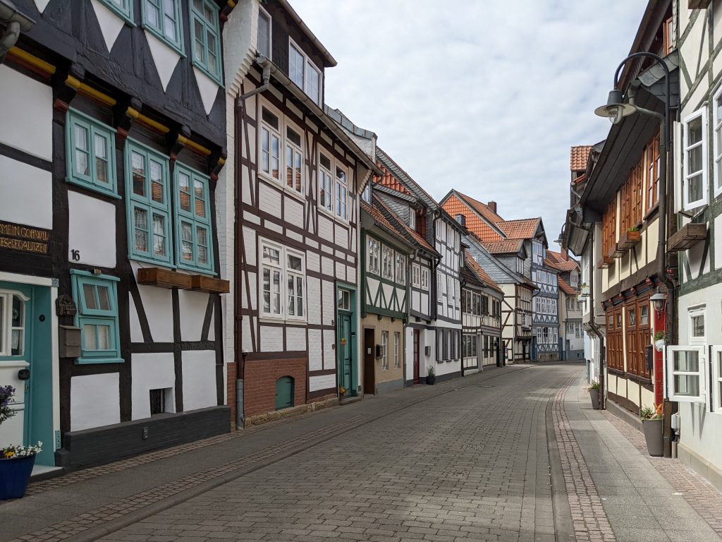 Die meisten Häuser hier sind nur zweigeschossig und schmal. Früher wohnte hier der ärmere Teil der Bevölkerung. Heute sind alle Häuser wieder hübsch zurechtgemacht und entfalten ihre Wirkung ohne dass großer architektonischer Aufwand betrieben wird. Durch den bogenförmigen Verlauf der Straße hat man immer wieder die Fassaden im Blick anstatt bei einer geradlinigen Straße daran vorbeizuschauen. Blumenkübel und Sitzbänke begleiten den Weg. Für mich ist die im Wortsinne „Krumme“ Straße die schönste in Wolfenbüttel.