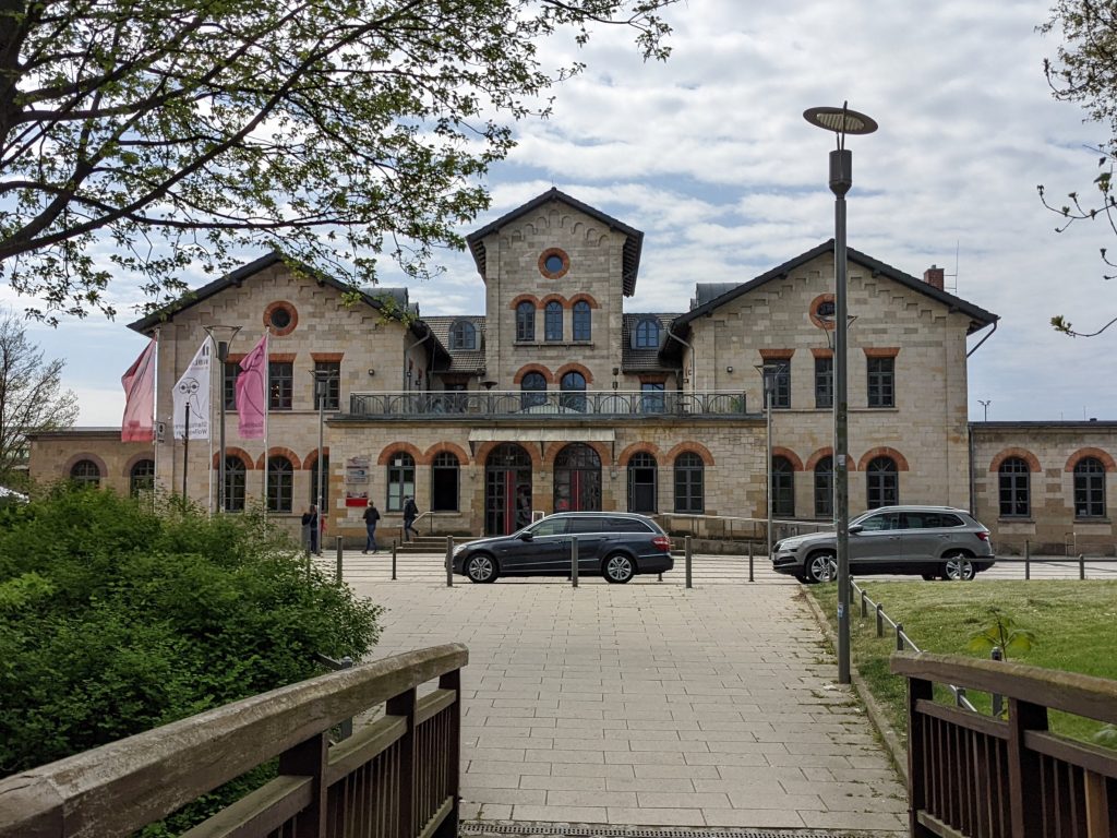Durch den Park geht es zum Harztorwall, der kurioserweise teilweise aus zwei parallel verlaufenden Straßen besteht. An der Post vorbei und die Bahnhofstraße überquerend kommen wir zum Bahnhof. Das heutige Empfangsgebäude stammt von 1853. So wie in Braunschweig der repräsentative Ottmerbau nicht das erste Bahnhofsgebäude war, gab es hier schon 1838 einen Vorgängerbau.