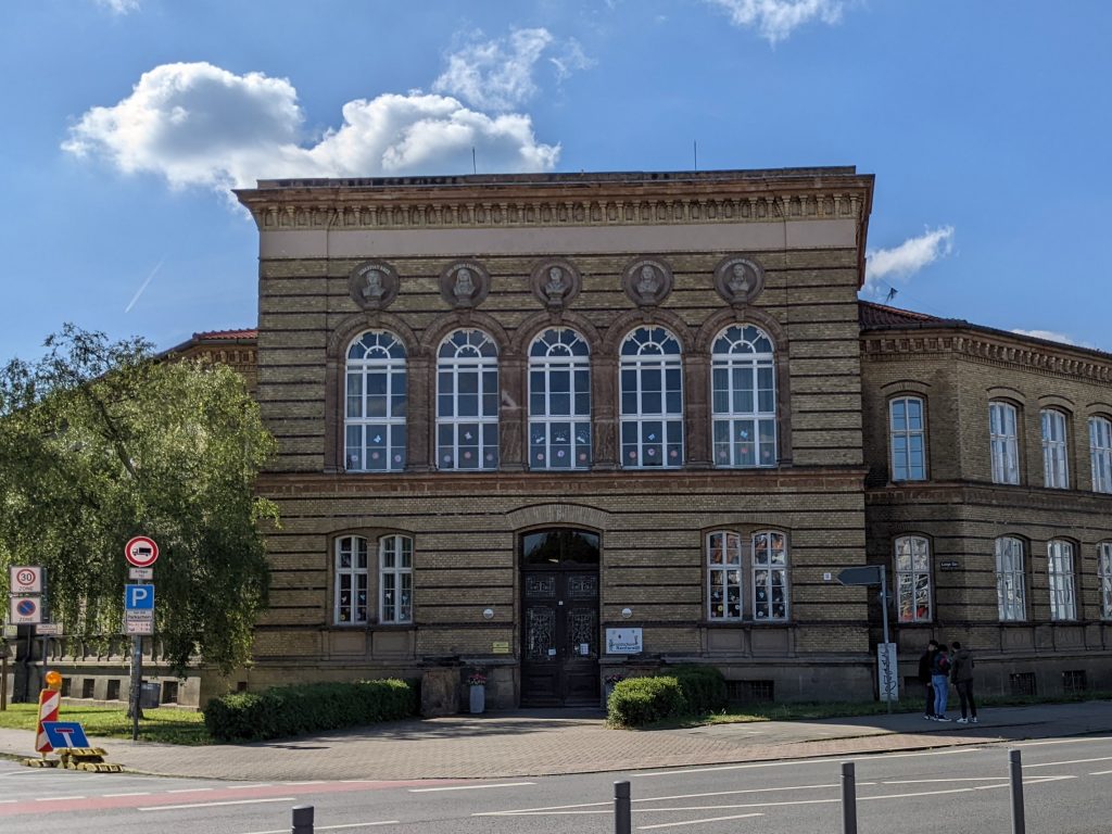 Gegenüber dem Theater befindet sich die Grundschule Harztorwall. Mit den Büsten im Obergeschoss macht sie nicht den Eindruck einer Grundschule, und tatsächlich war das Gebäude zu seiner Bauzeit 1872-79 für das Herzogliche Lehrerseminar vorgesehen.