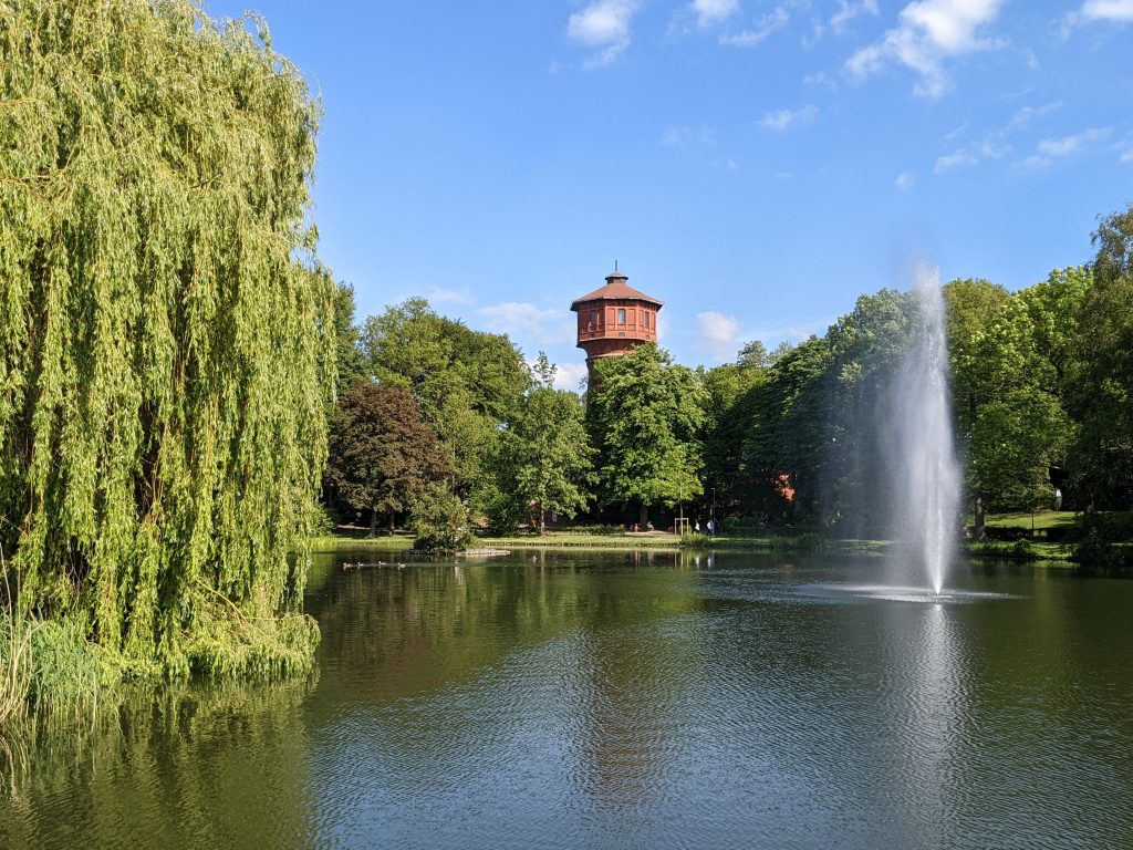 Am südöstlichen Ende steht seit 1893 (also 8 Jahre länger als der in Braunschweig) der Wasserturm, der sich in der Flucht des Teichs malerisch in die Landschaft einfügt.