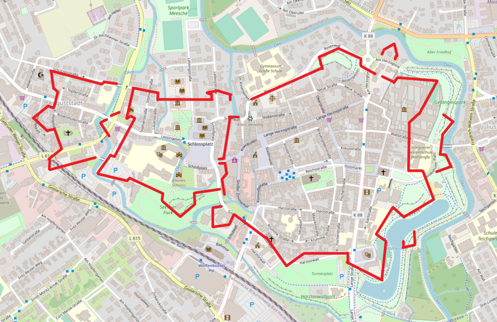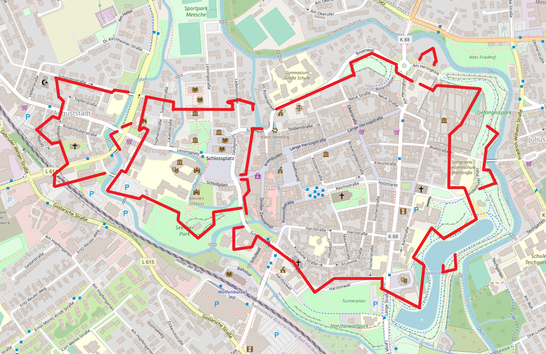 Ähnlich wie Braunschweig war Wolfenbüttel einmal von einer Stadtbefestigung umgeben, deren zentrales Element die aufgestaute Oker war. Hier sieht man rot markiert den ungefähren Verlauf der inneren Linie des Befestigungssystems: