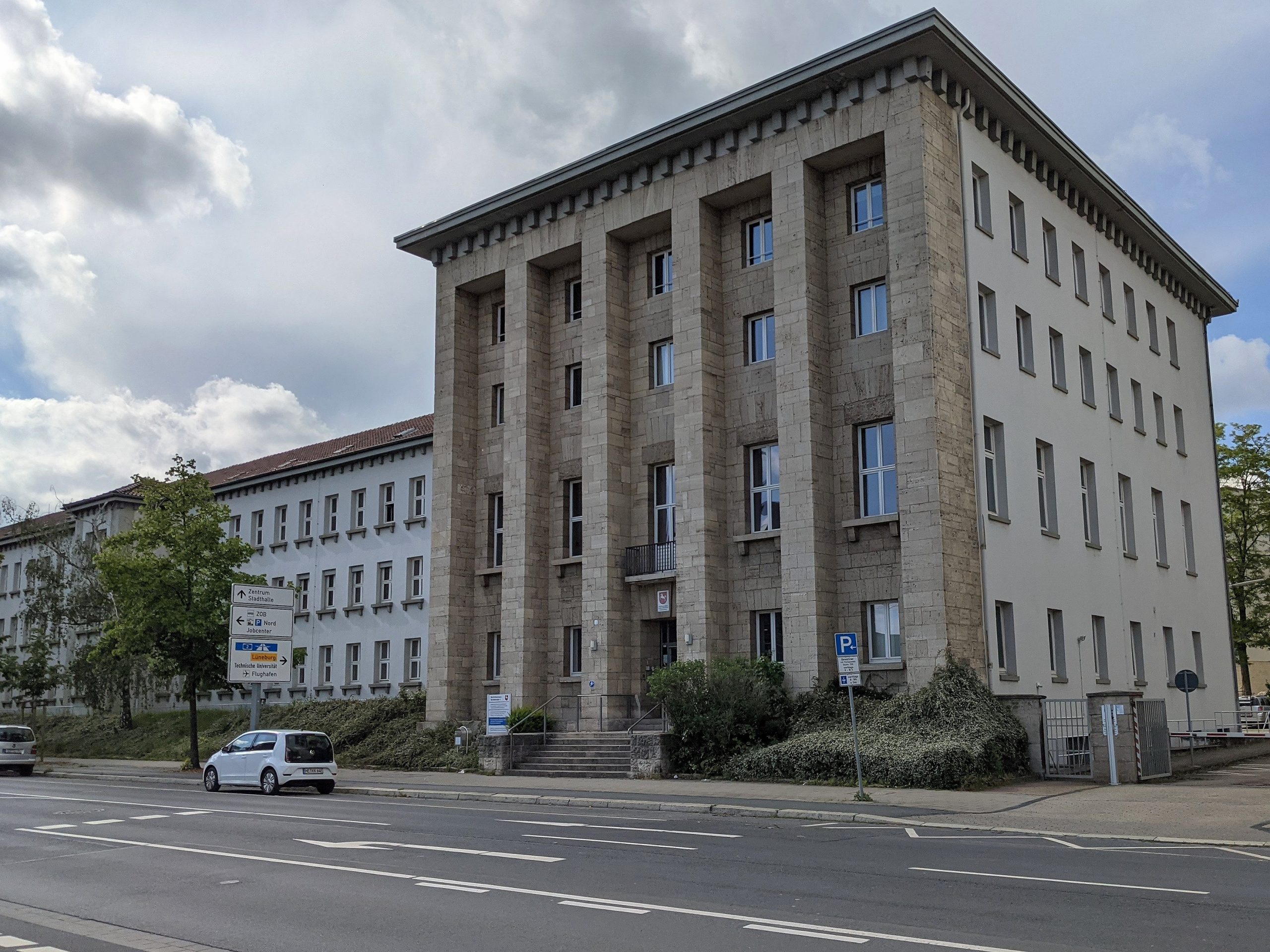 Das Gebäude auf der anderen Straßenseite ist unverkennbar Nazi-Architektur. Es wurde 1938 als Stabsgebäude für die 31. Infanteriedivision und das 31. Infanterieregiment gebaut. Heute ist die Nutzung friedlicher: zum einen findet sich hier ein Studienseminar (für die Lehrerausbildung während der Referendariatszeit), zum anderen mehrere kleinere Landesbehörden.